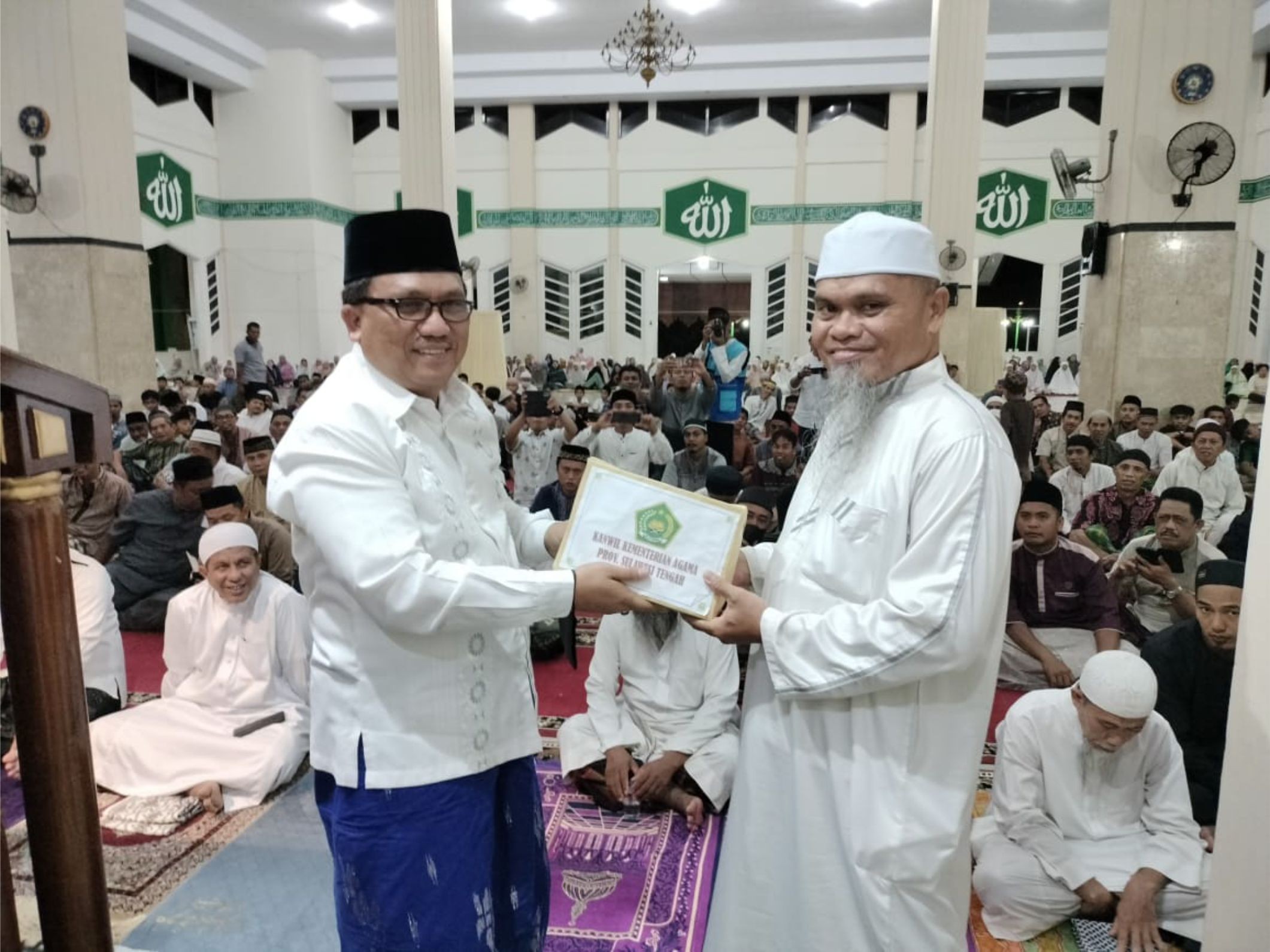 Kepala Kanwil Kemenag Ulyas Taha pada kesempatan itu memberikan bingkisan Alqur’an kepada Pengurus Masjid Agung Al Mubarak diterima langsung oleh Imam Masjid tersebut.